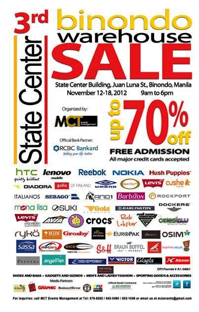 After the successful staging of the 2nd Binondo Warehouse Sale last summer, shoppers and exhibitors alike can’t wait for the 3rd BINONDO WAREHOUSE SALE. It will be a week-long event from November 12 to 18, 2012 from 9am to 6pm at the Ground Floor of the State Center Investment Building, along Juan Luna St., just across the St. Lorenzo Ruiz Church. (location maps below)