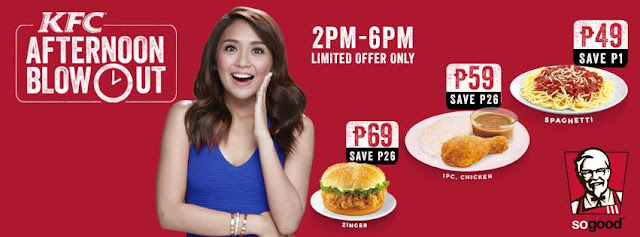 Have a filling meal-yenda with KFC Afternoon Blowout! Your KFC favorites now made more affordable! Get Spaghetti for just P49, 1-pc Chicken with Rice for just P59 or Zinger for just P69! The KFC Afternoon Blow Out Promo is available everyday in all KFC outlets from 2pm to 6pm.